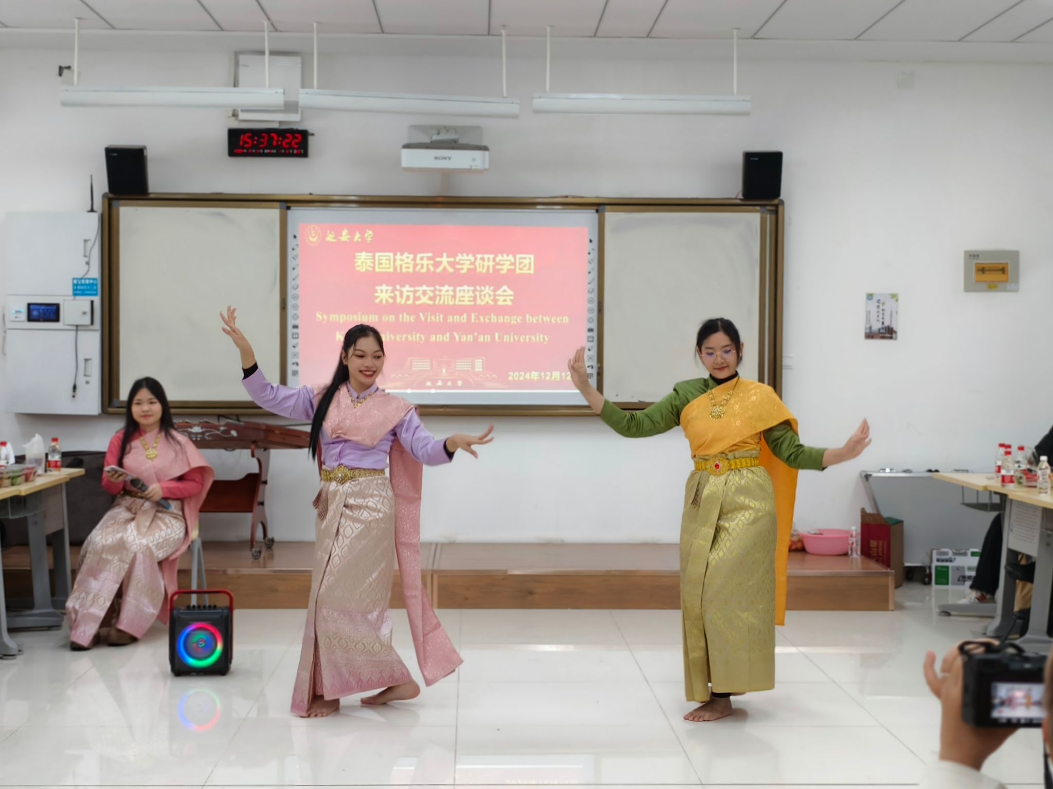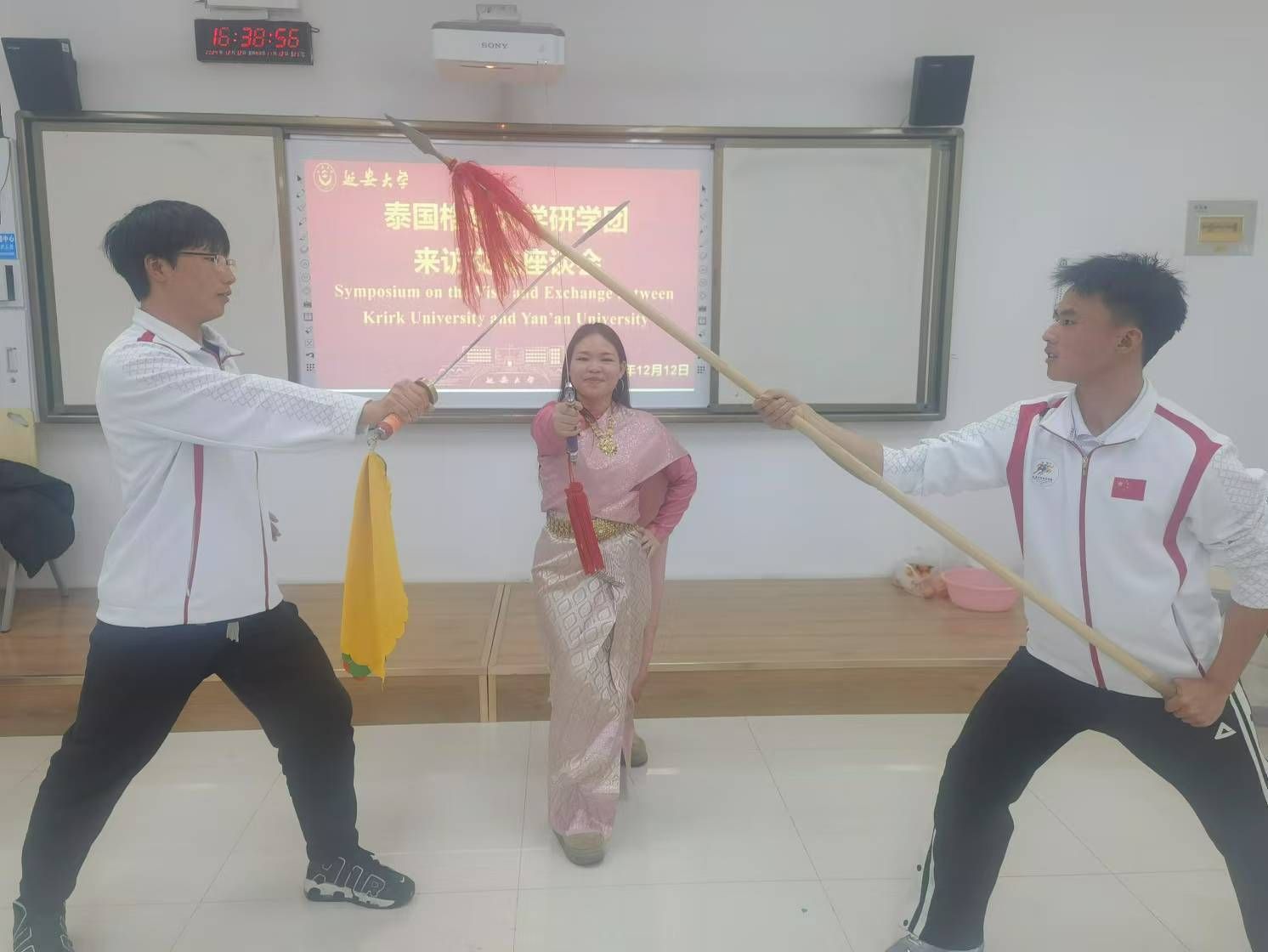 学生代表交流座谈会。外国语学院、鲁迅艺术学院、体育学院、文学院和经管学院30余名学生参加了座谈交流。座谈会上,格乐大学的同学们身着泰国民族服饰,表演了优美的泰国舞蹈,我校学生先后展示了扬琴、琵琶演奏,表演了中国古典舞、蒙古舞、中国武术和安塞腰鼓,演唱了陕北民歌,泰国学生学习体验了中国书法的书写方法和技巧。随后,两校师生同学们围绕民族文化、大学生活、专业学习等方面进行了交流。