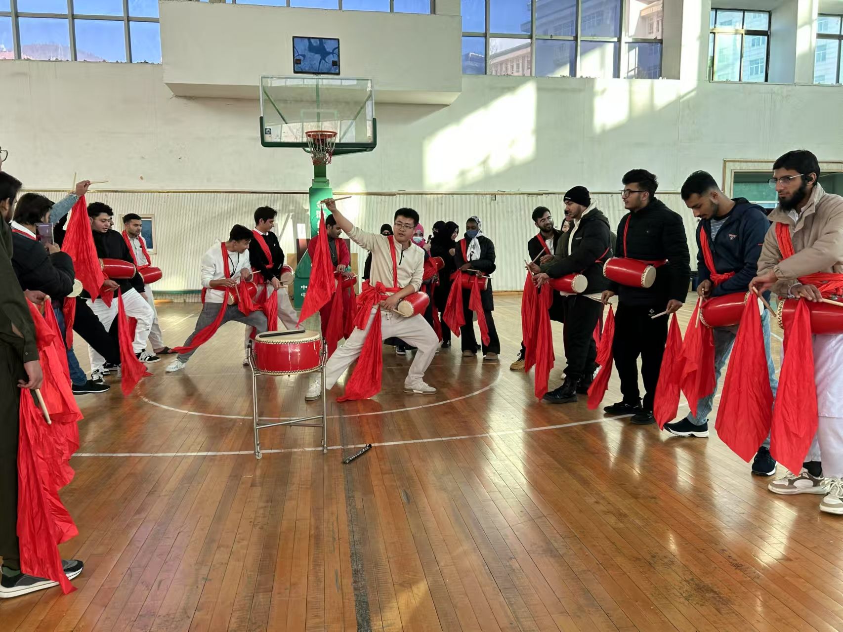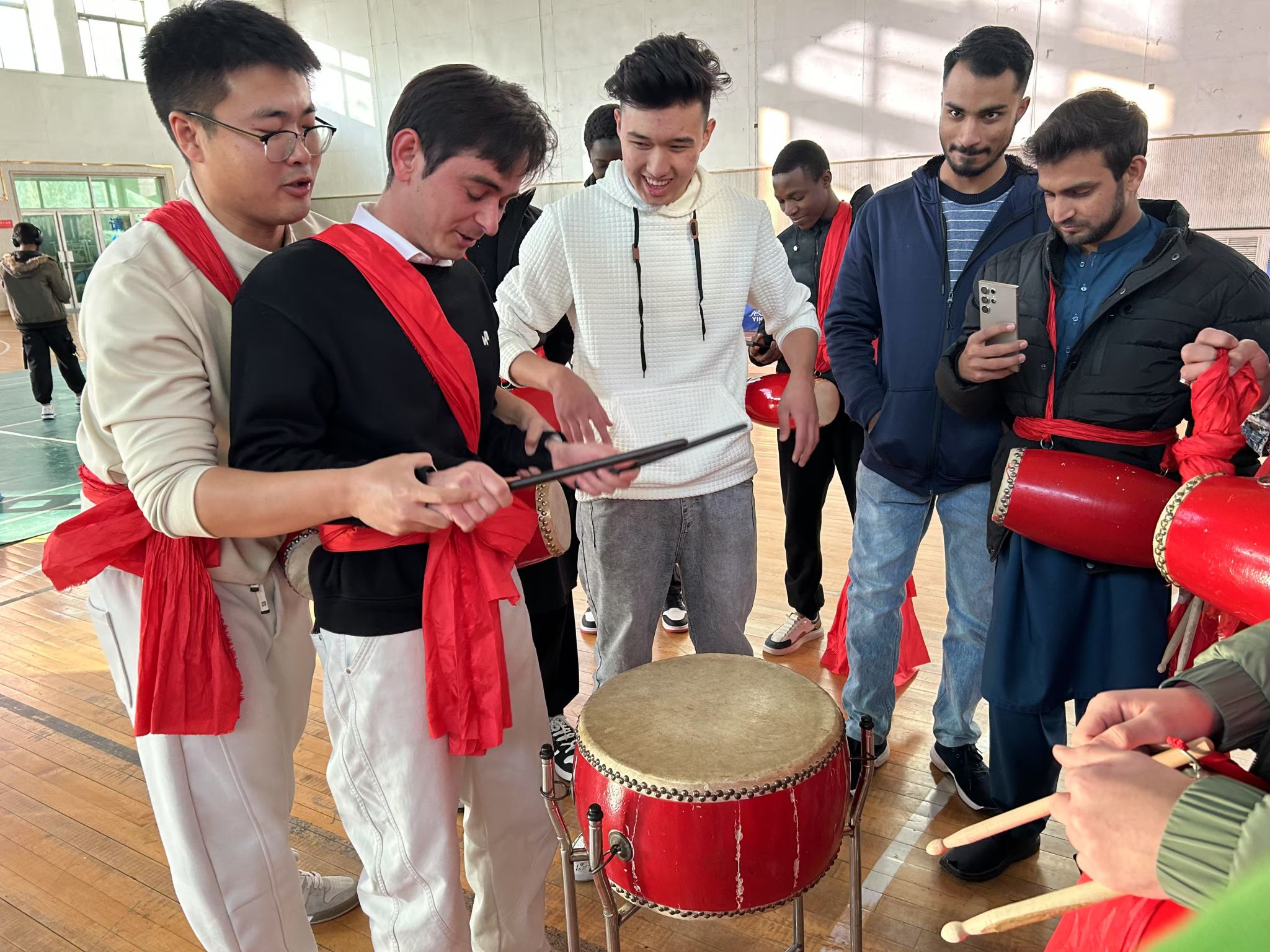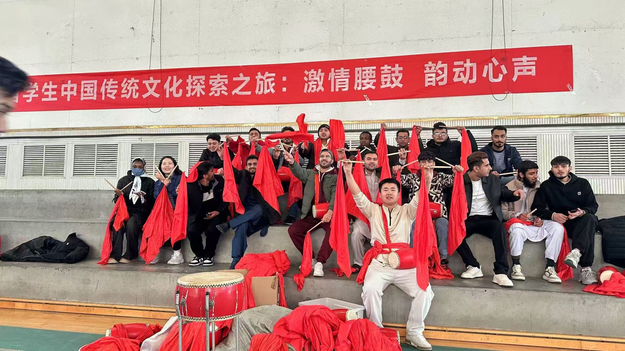 腰鼓作为陕北地方独特而具代表性的艺术形式,其豪迈粗犷的动作变化,刚劲奔放的雄浑舞姿,充分体现着陕北高原民众憨厚朴实、悍勇威猛的个性与性格。12月6日,我校体育学院马镇嘉老师在展示中向留学生介绍了腰鼓的佩戴方式、鼓槌使用手法、打鼓时的技法以及腰鼓鼓点的韵律。留学生们怀着激动的心情,挥舞着手中的鼓槌,跟随着老师的步伐和节奏,闪挪腾跃,红绸飞舞,场面活跃而热烈。通过沉浸式体验我国地方文化特色,让国际学生在潜移默化中受到中国传统优秀文化的熏陶,触摸中华文化脉络,感受中华文化魅力。