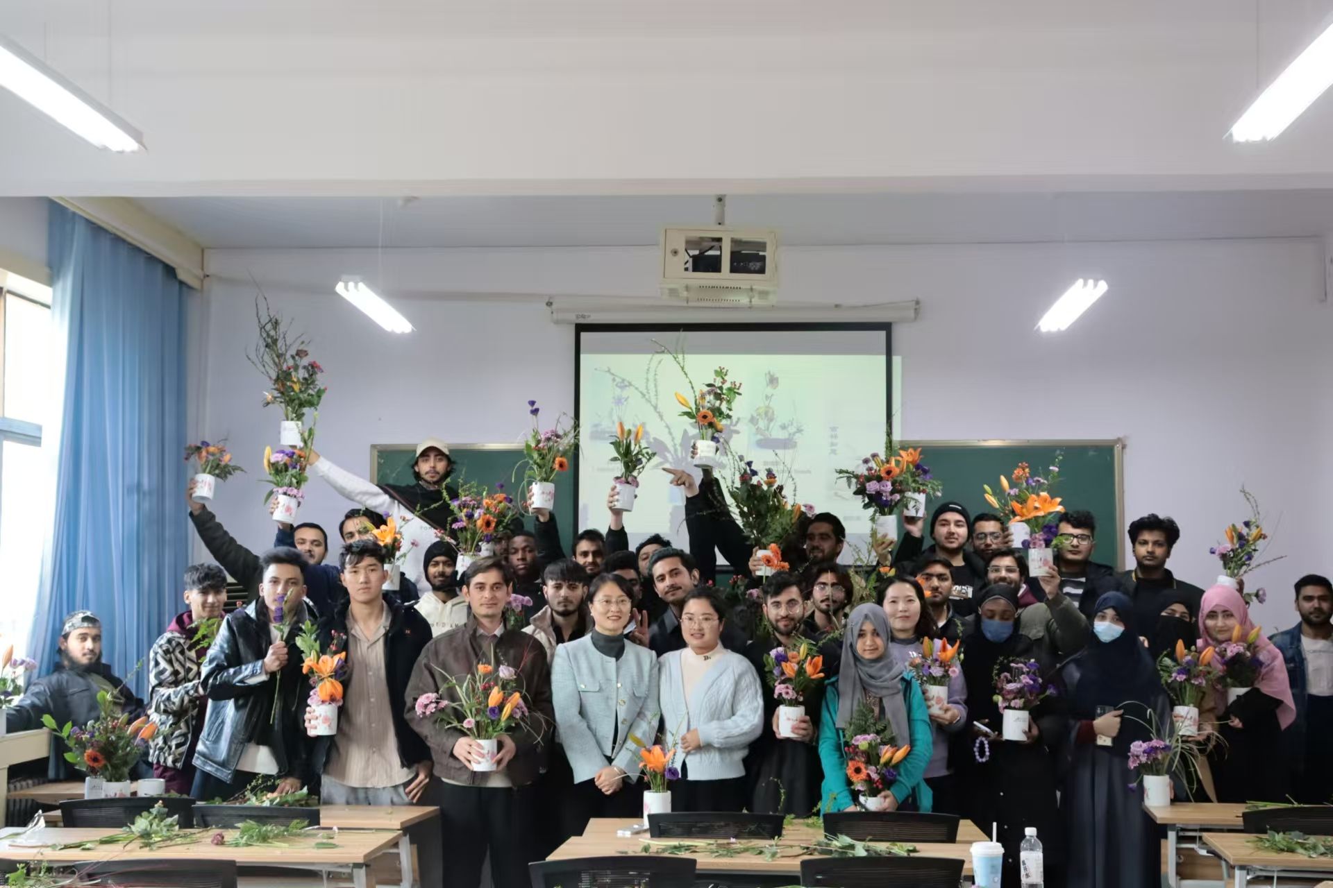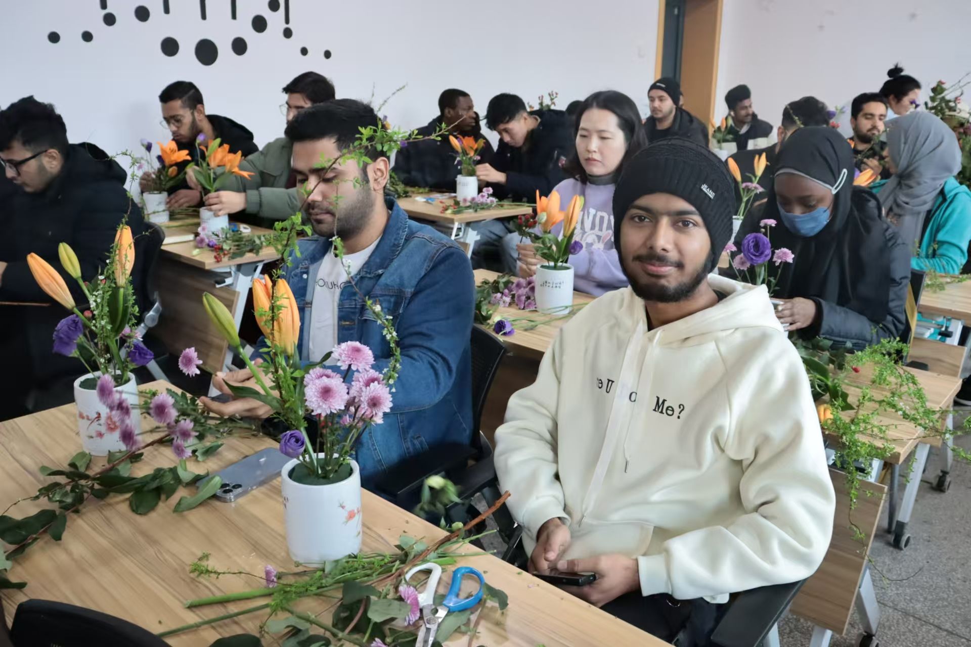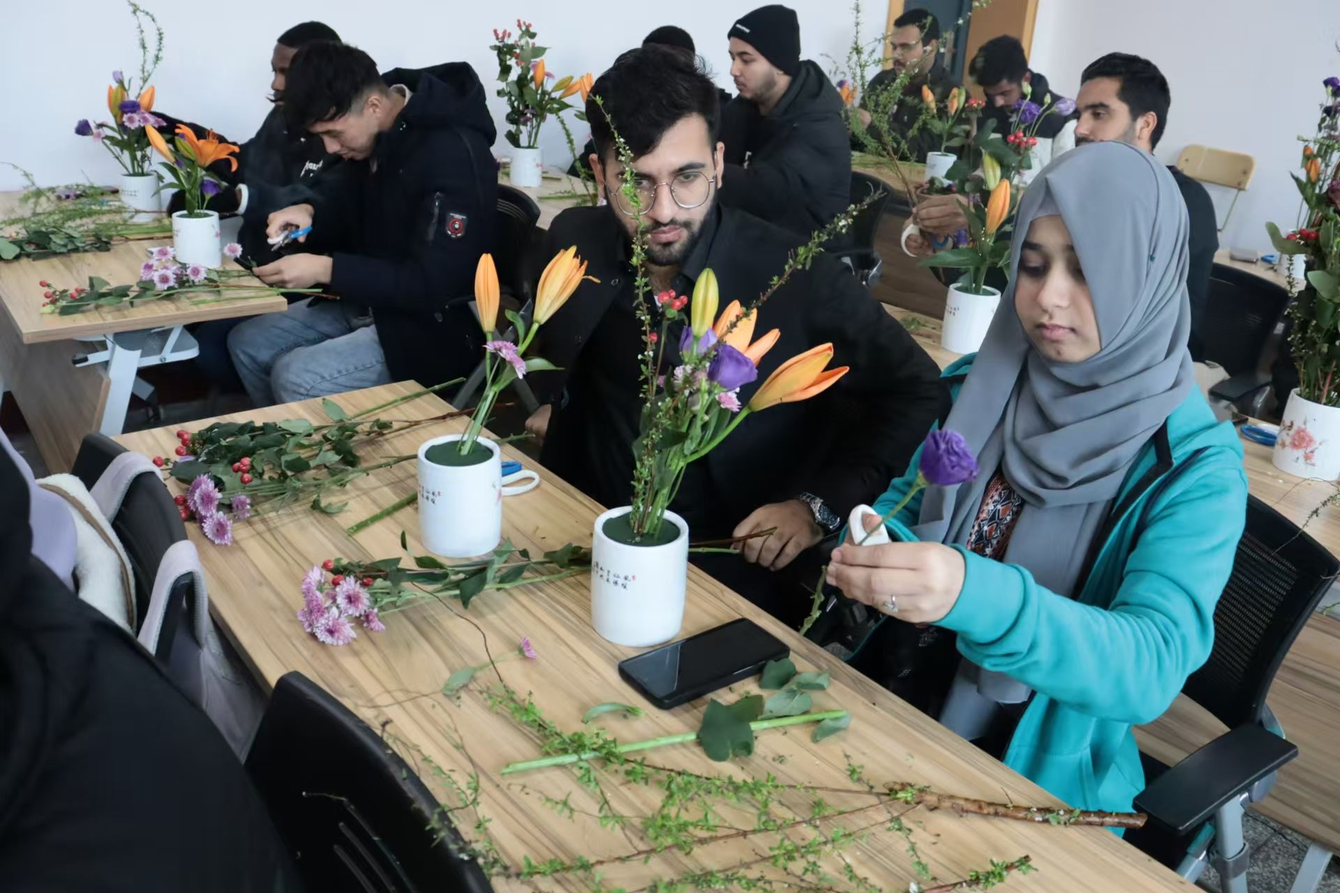 在插花展示环节中,屈老师用专业的手法向留学生展示了基础的插花技巧,包括:花材与花器的协调、疏密有致、虚实结合、高低错落等。看得留学生们目瞪口呆、欢呼声一片。通过亲身体验中国插花艺术的魅力,留学生们徜徉在花海中久久不能自拔。