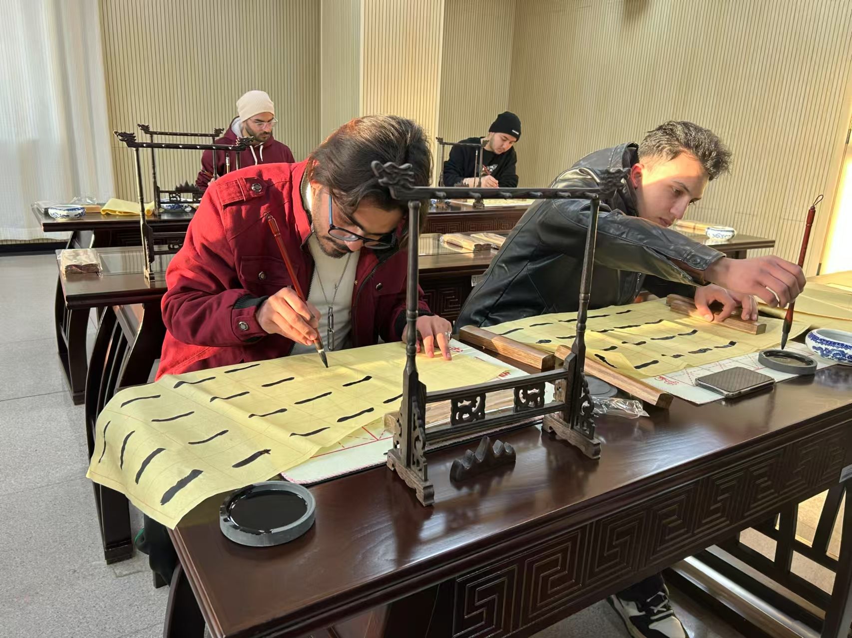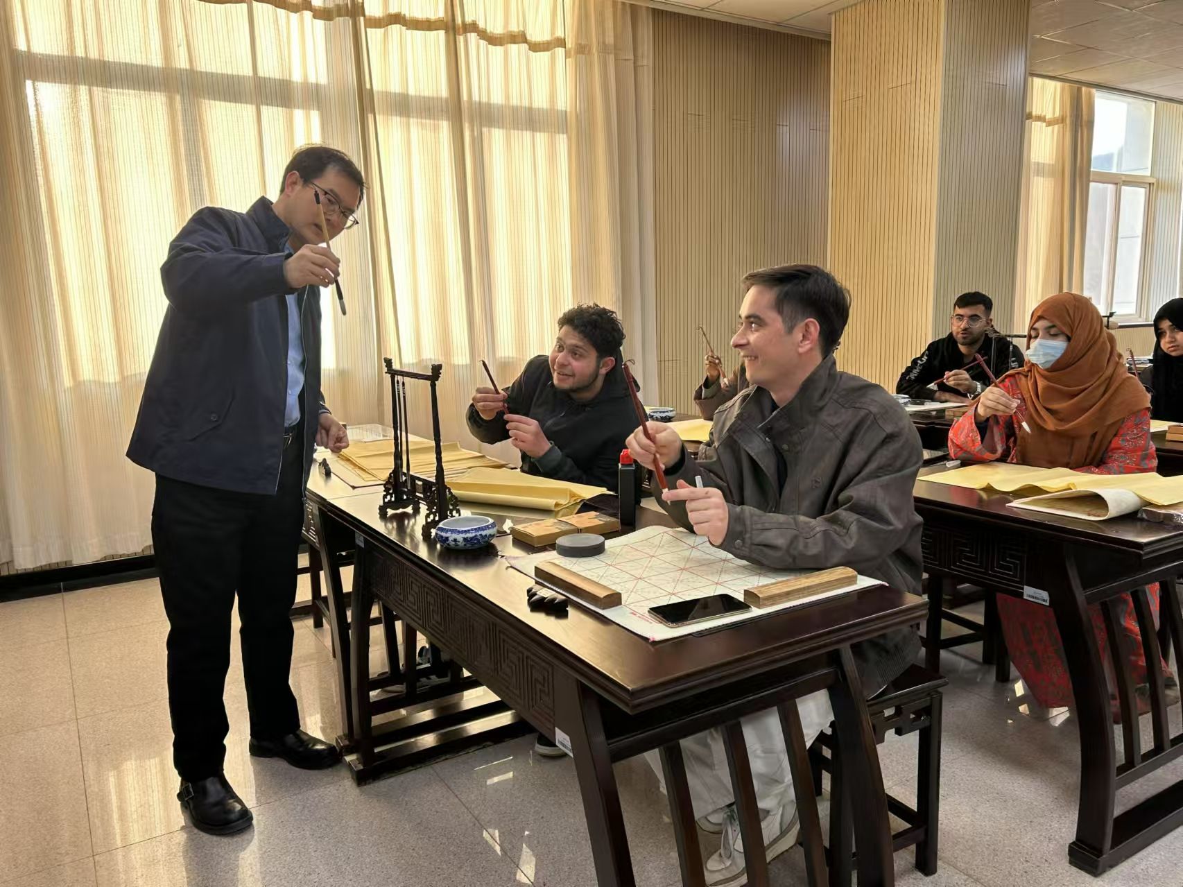 汉字经历几千年的演变,代表着中国博大精深的特色文化,通过中国书法的教学可以让留学生亲身体验中国文化。12月20日,我校教师发展中心李晓峰老师向留学生详细介绍了“笔、墨、纸、砚”等书法工具,并通过图片展示了中国书法艺术的独特魅力。他向大家示范了握笔姿势及基本笔画的写法,在实践环节中,李晓峰老师指导留学生体验了中国书法的魅力。从练习简单的笔画开始,逐步尝试写出自己熟知的汉字。活动现场充满了欢声笑语,每位学生都在书法练习中感受到中国传统文化的博大精深,大家纷纷展示自己的作品,收获满满的成就感。