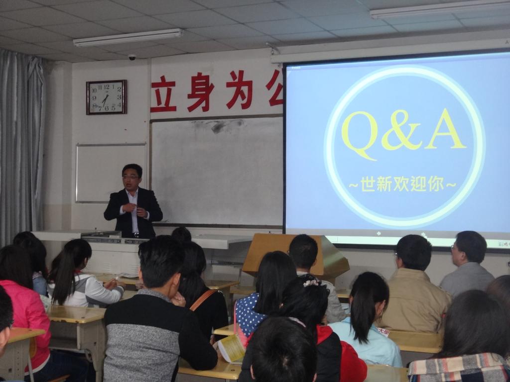 2014年3月31日19点,应我校国际文化交流学院邀请,台湾世新大学行政管理学系教授、国际廉能治理硕士学程主任、北京大学政府管理学院法学博士邱志淳教授,台湾世新大学大陆研修生服务中心负责人潘庆霖先生,在周扬楼2105教室作了我校与世新大学短期研修2014年秋季招生项目专题说明会。我校60余名学生前往听取了说明会。