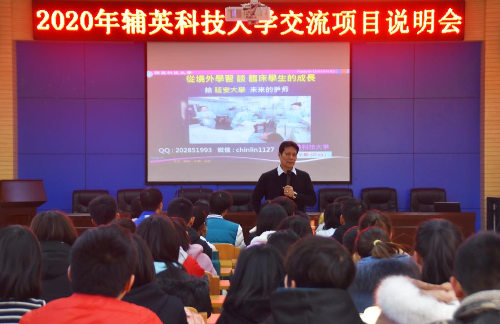 12月11日下午,应国际文化交流学院与医学院邀请,台湾辅英科技大学两岸交流中心主任叶金麟先生在医学院校区学术报告厅作了我校与辅英科技大学2020学年交流项目专题说明会。医学院严盼盼老师与国际文化交流学院张杰老师同来自护理系及医学检验技术系的150余名学生参加了说明会。会议由张杰老师主持。