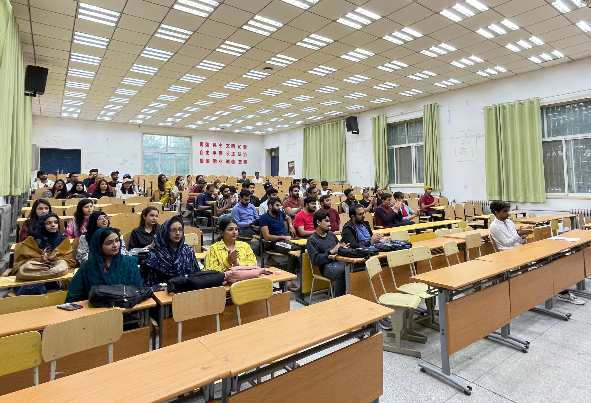 郭宏文通过主题讲座的形式,全面细致地讲解了中国有关外国人的法律法规,包括:临住登记、非法就业、非法旅行、签证问题、宗教活动等。提醒学生要遵纪守法、切不可以身试法。